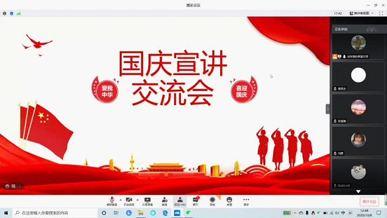今年正值中华人民共和国建国71周年,为贯彻落实习近平同志在全国高校思想政治工作会议上的重要讲话精神,切实加强学校思想政治工作的开展力度与深度,引导学生认识和把握中国特色社会主义的历史必然性,树立为共产主义远大理想和中国特色社会主义共同理想而奋斗的信念和信心,2020年10月8日,水果派解说 国庆宣讲交流会顺利举办。根据疫情常态化防控要求,本次宣讲交流会采取线上的形式举办。会议由2020级学生徐张弛主持,水果派解说 2020级辅导员张楚翘及全体本科新生参加了本次活动。