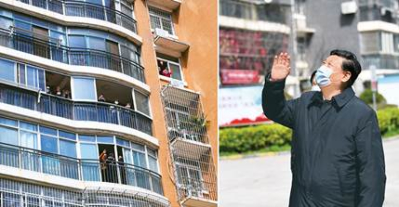2020年3月10日,中共中央总书记、国家主席、中央军委主席习近平专门赴湖北省武汉市考察新冠肺炎疫情防控工作。这是习近平在东湖新城社区考察时,向在家隔离居住的居民挥手致意、表示慰问(拼版照片)。 新华社记者 谢环驰/摄