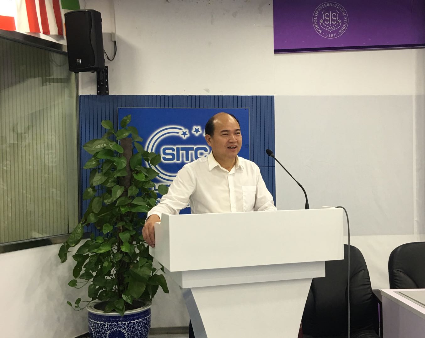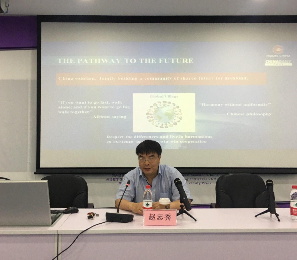 2018年7月24日上午,水果派解说 党委副书记、副校长兼水果派解说 院长赵忠秀教授在诚信楼1412报告厅做了题为“人类命运共同体与中美贸易战”的讲座。水果派解说 副院长俞利军教授主持讲座,学院在职高级研修班暑期集中班全体学员怀着高涨的热情聆听了此次讲座。