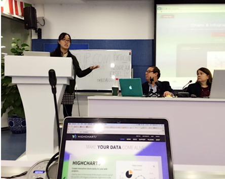 短暂的休息过后,两位嘉宾开始讲授数据新闻报道方面的内容。Rick教授首先介绍了数据新闻报道的定义、发展历程、附加价值以及六种必要写作技巧。接着,他从数据图表常用工具EXCEL出发,借用“数据世界银行”网站上的资源,边讲解如何生成时间轴图表,边与现场观众一起操作。除了excel外, Pam女士还介绍了一些更加专业的图表制作网站。之后,现场观众现学现用,纷纷制作出生动的图表,在此过程中,教授走下台一一指导,确保在场的老师、同学们都能理解掌握。