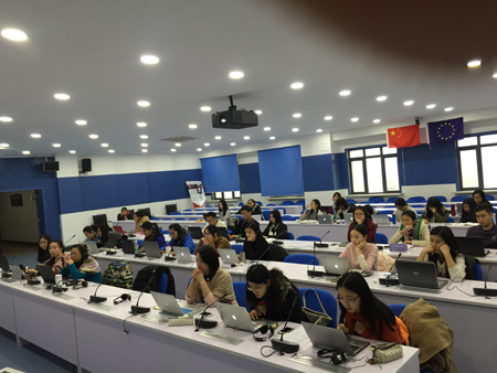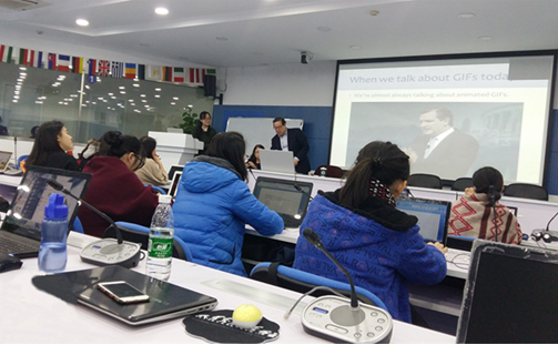 紧接着,Rick教授分析了目前大数据时代受众“读图化”的阅读趋向,并配合幻灯片一步步讲述运用制图工具生成动态图像的方法。为了让同学们更加有效地学习到制图技术,Pam女士还以她个人常用的制图工具为例,亲自演示动态图生成过程,包括截屏、合成等细节,并为现场观众推荐了诸多实用的工具资源,供课后学习与操作。