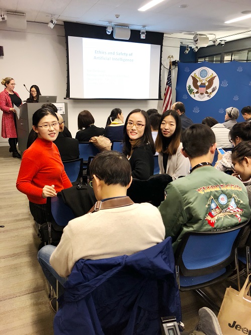 2018年11月13日晚,在我院国际财经新闻研究中心主任、语言文学系副系主任钱晶晶老师的带领下,我院商务英语专业硕士研究生同学张菡芝、许婉然赴安家楼美国大使馆的北京美国中心,参加题为“人工智能的道德与安全”的主题学术讲座。