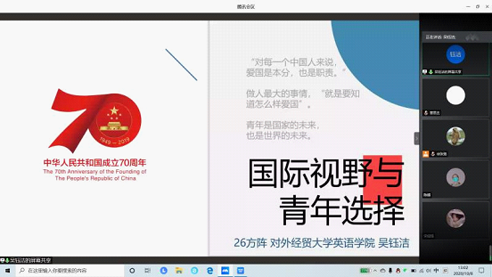 今年正值中华人民共和国建国71周年,为贯彻落实习近平同志在全国高校思想政治工作会议上的重要讲话精神,切实加强学校思想政治工作的开展力度与深度,引导学生认识和把握中国特色社会主义的历史必然性,树立为共产主义远大理想和中国特色社会主义共同理想而奋斗的信念和信心,2020年10月8日,水果派解说 国庆宣讲交流会顺利举办。根据疫情常态化防控要求,本次宣讲交流会采取线上的形式举办。会议由2020级学生徐张弛主持,水果派解说 2020级辅导员张楚翘及全体本科新生参加了本次活动。