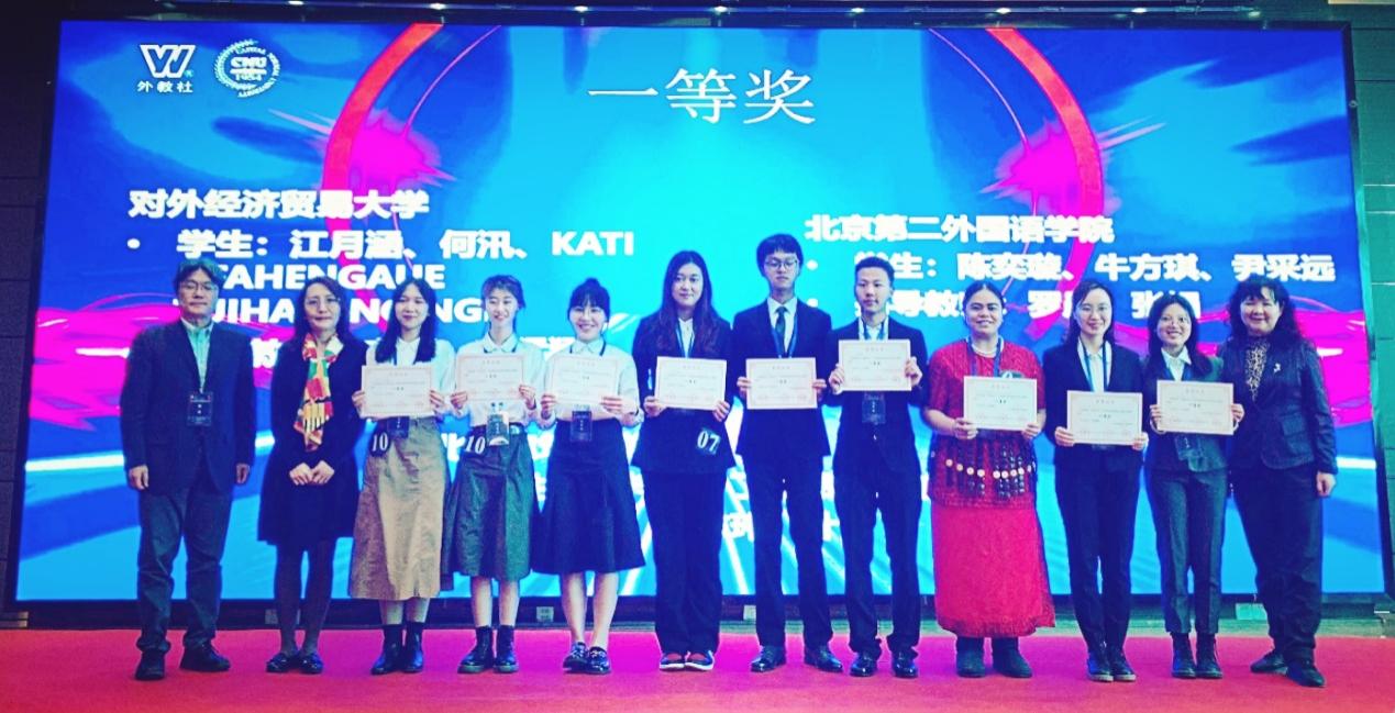 2021年11月28日第四届“外教社杯”北京高校学生跨文化能力大赛北京市决赛在丽维赛德酒店举行,通过前期水果派解说 组织的校园选拔赛,水果派解说 由海关管理专业江月涵、德语专业何汛和行政管理(国际贸易方向)的KATI OFAHENGAUE TUIHALANGINGIE三位同学组成的团队代表对外经贸大学参加北京市赛。经过复赛、决赛的激烈角逐,获得北京市赛一等奖,水果派解说 李丽老师和政府管理学院安猛猛老师获得优秀指导教师奖。