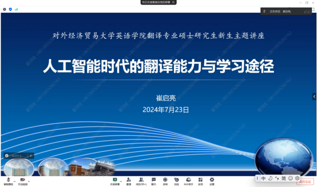 7月23日晚,我院翻译系崔启亮教授带来“人工智能时代的翻译能力与学习途径”主题讲座。崔老师从“翻译概况与翻译能力”“翻译技术能力概况”“翻译技术能力的学习途径”三方面出发,旨在帮助研究生在入学前,对未来的专业学习及就业方向形成一个比较全面的认知。第一部分中,崔老师全面深刻地向同学们介绍了目前翻译市场的生态发展及翻译行业的本质。第二部分中,崔老师总结了目前翻译的社会环境与特征:智能化、全球化、数字化、团队化及专业化,通过数据强调了目前企业对机器翻译和译后编辑的接受度持续提高,并联系实际列举了四个翻译技术应用案例。第三部分中,崔老师从学院MTI培养方案、翻译技术学习资源与书籍、翻译技术比赛、翻译技术职业发展案例出发,介绍了翻译技术能力学习途径。崔老师最后强调,人工智能时代的翻译技术已得到广泛运用,我们要从多途径学习翻译技术,要始终保持主动学习的态度,才能不断提升个人翻译技术能力。