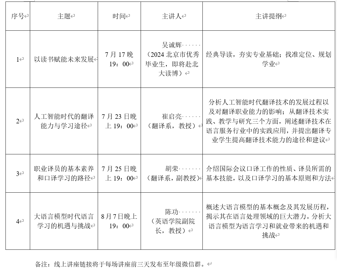 为提升拔尖创新人才自主培养质量,建设高质量研究生教育体系,全面落实《关于中央部门所属高校深化教育教学改革的指导意见》《关于加快新时代研究生教育改革发展的意见》《关于深入推进学术学位与专业学位研究生教育分类发展的意见》等相关文件精神,帮助我院新生提前适应研究生学习科研节奏,学院暑期以线上方式举办了聚焦英语学科前沿的四场专题讲座,2024级水果派解说 全体研究生新生参加。
