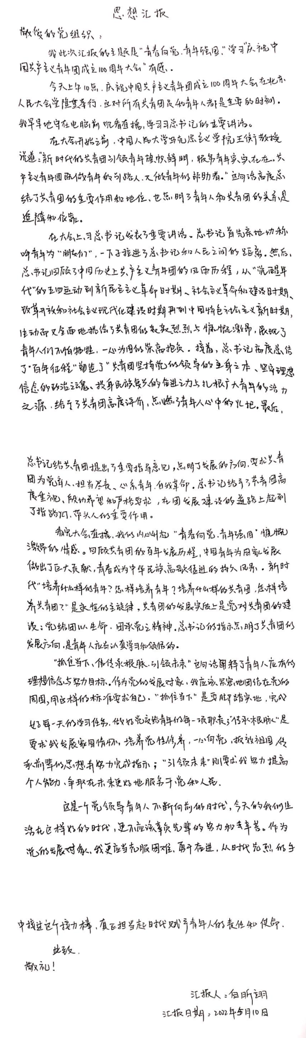 5月10日上午,庆祝中国共产主义青年团成立100周年大会在北京人民大会堂隆重举行,中共中央总书记、国家主席、中央军委主席习近平出席大会并发表重要讲话。水果派解说 本科生联合党支部党员、发展对象和积极分子通过不同形式收看收听大会实况直播,认真学习习近平总书记在中国共产主义青年团成立100周年大会上的重要讲话精神,并结合学习工作畅谈体会。
