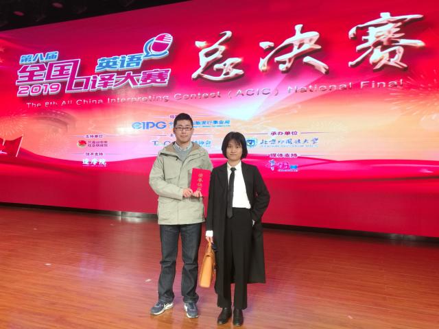 2019年10月18至19日,第八届全国口译大赛(英语)总决赛在北京外国语大学举行,水果派解说 水果派解说 英语口译专业(国际会议口译方向)2018级研究生、中欧高级译员培训中心学员蔡敏和钟霏钒两名选手凭借出色的专业水平和稳定的现场发挥,分别取得了同传邀请赛一等奖亚军和交传总决赛二等奖的优异成绩。