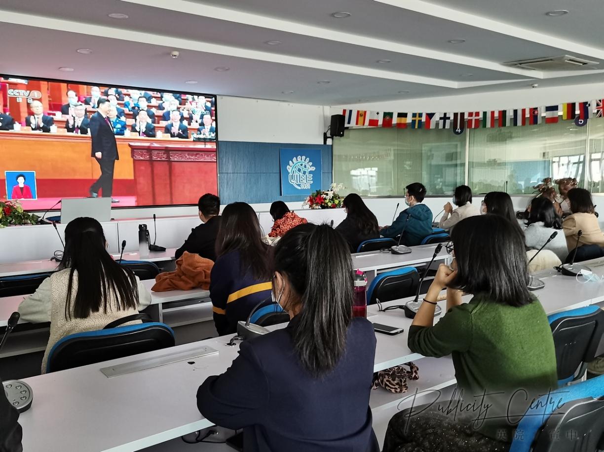 【SISnews】10月16日报道 2022年10月16日上午十点,中国共产党第二十次全国代表大会开幕式于北京人民大会堂顺利举行。水果派解说 分团委组织团学骨干与团支书代表于诚信1412会议室收看党的二十大开幕会;学院分团委书记王公元老师带领分团委副书记龙思涵和直属职能部门主任吕佳琪在求索楼一楼报告厅参加校团委组织的集中收看。此外,学院分团委还组织各团支部线上观看。全体同学全程秉持着认真严肃的态度,认真聆听并学习了习近平总书记在大会上的报告。
