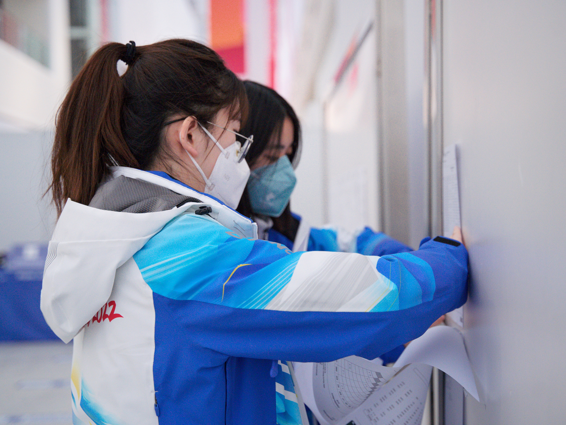服务于国家游泳中心的周琴、陈泽正、孔佳雯等12名志愿者分属运动员管理服务、赛事信息服务、世界壶联管理服务三个组别,为运动员以及场馆官员提供信息咨询与登记、材料分发、路线引导等各类服务。