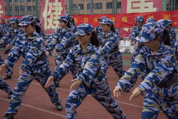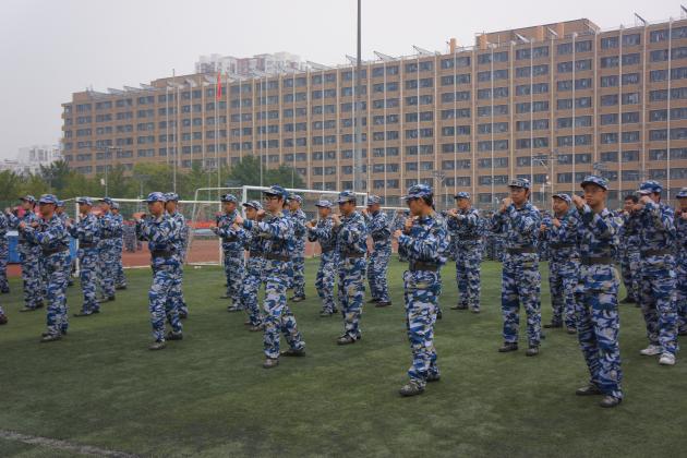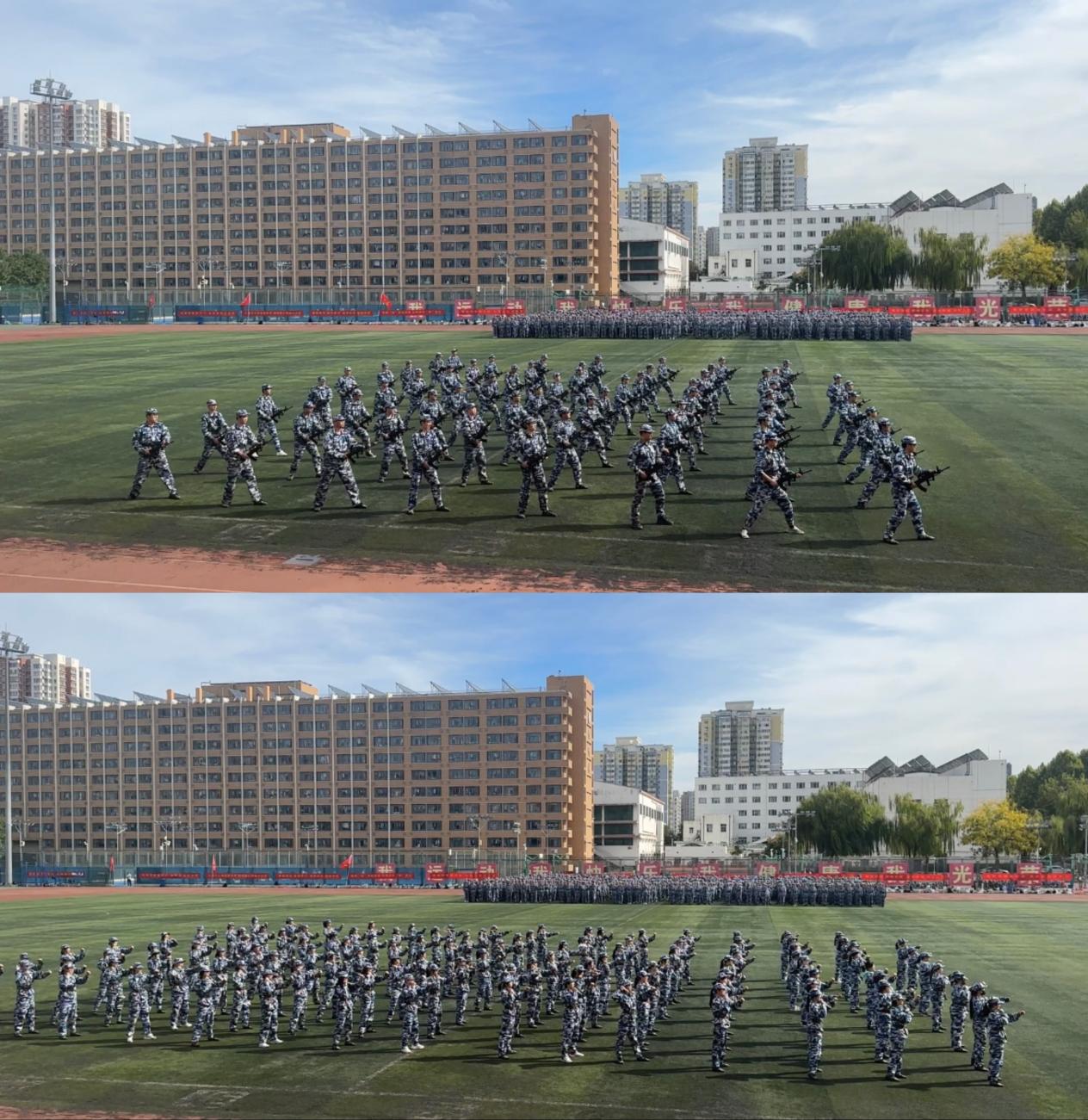 一共十六式的擒敌拳对动作的速度、准确度有着极高要求,也需要全体同学附以整齐划一而铿锵有力的口号和呐喊声。方阵的士气在声声口号中向操场撒播,秋风阵阵天气微凉,但青春的能量能将寒气驱散。