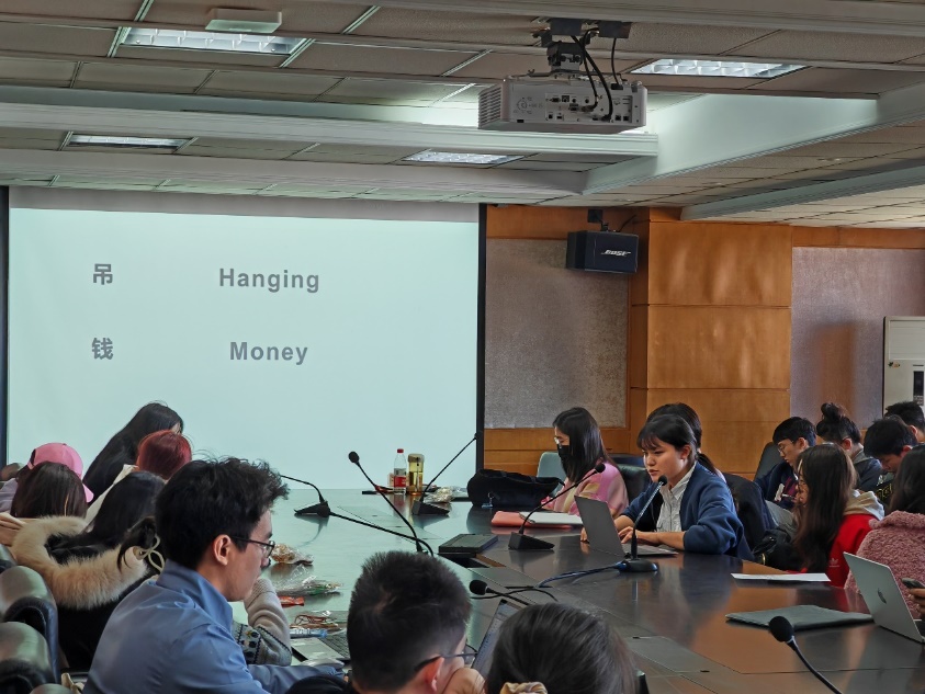 随后,水果派解说 2023级刘哲含同学对“吊钱”这一传统剪纸艺术进行了分享。刘同学从吊钱的英文释义出发,向同学们介绍了吊钱的文化内涵和现代应用。“吊钱”一般为一张雕刻有花纹图案的长方红纸,下似“流苏”,因能烘托节日气氛而广受欢迎。