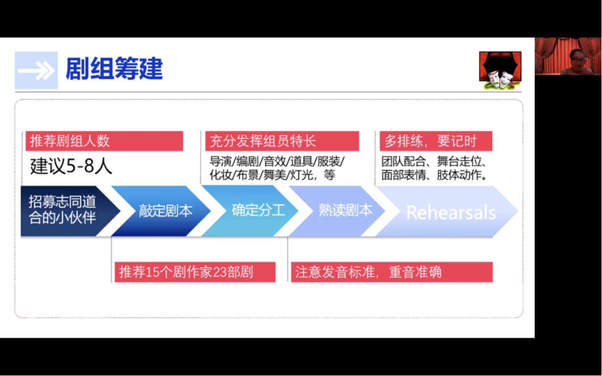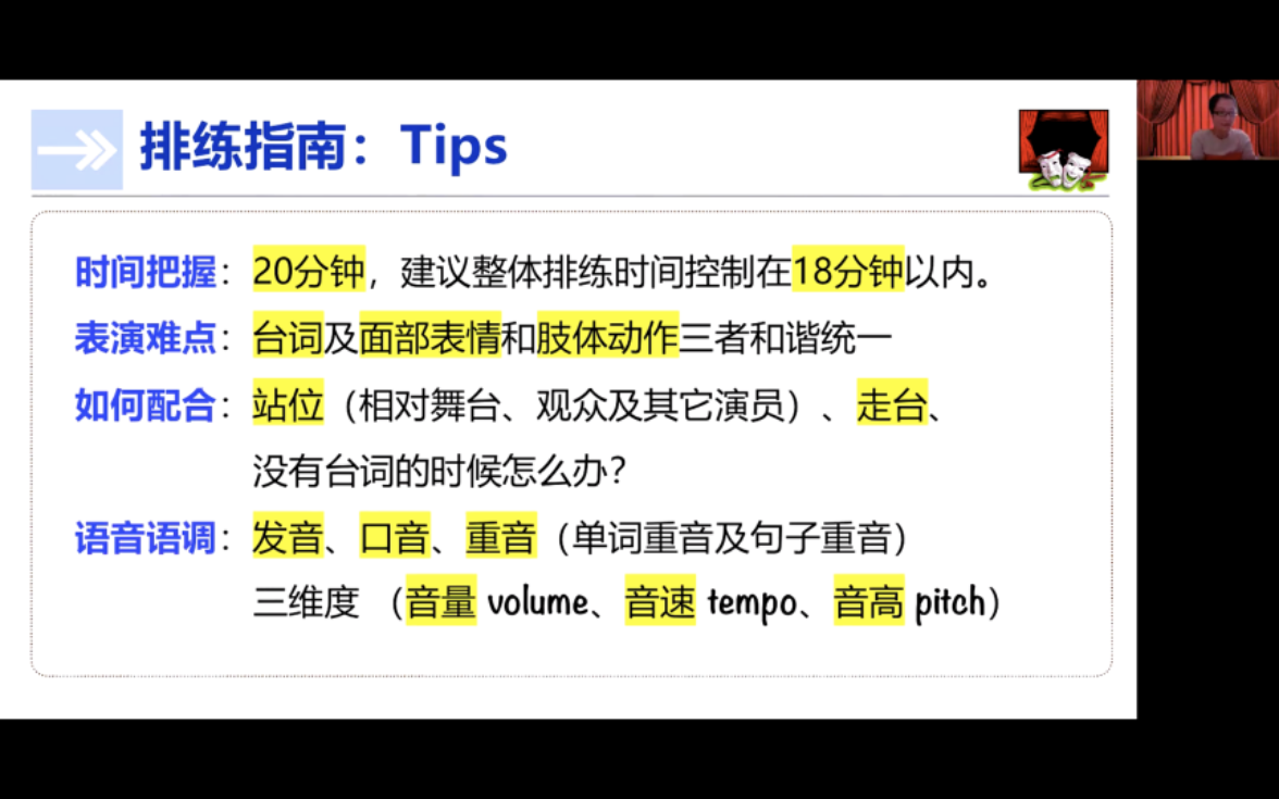 接下来,李啸初老师针对剧组筹建进行了梳理和指导:先招募志同道合的小伙伴,待共同敲定剧本后,根据组员的特长确定分工并熟读剧本,最后进行多次计时排练。老师强调,同学在排练时需特别注意20分钟的时间把握,台词、面部表情和肢体动作的和谐统一,站位、走台的配合,以及发音、口音、重音三维度的练习。这四部分内容既是排练的重点,也是排练的难点。