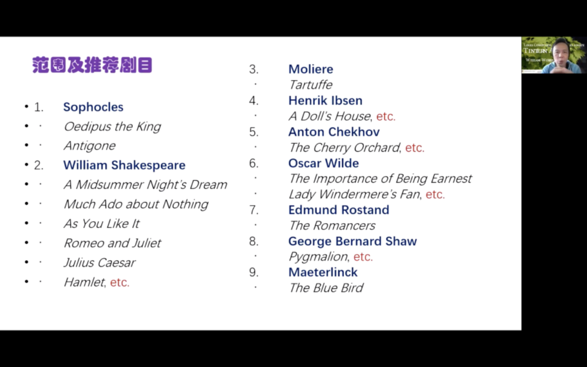 最后,李军老师为同学们推荐了几部经典剧目,并给出了选剧和改编的相关建议。本次比赛推荐剧目有23部,除了莎士比亚的经典剧目,李军老师还重点推荐了索福克勒斯的《俄狄浦斯王》,莫里哀的《伪君子(达尔蒂夫)》,易卜生的《玩偶之家》,王尔德的《不可儿戏》和《温德密尔夫人的扇子》等。关于选剧,老师建议不要选择大多人会选的剧目或片段,避免落入俗套,选剧求新求异更能让人眼前一亮。关于改编,李军老师鼓励大家敢于创新,但也不能因为追求创新而把原剧改得面目全非,使“创新”变成“创伤”,可适当通过剪辑和重构剧情来重新演绎主题,用戏剧性叙事的方式来取代平铺直叙,可以“架构性”地添加其他表演,还可以对台词进行创新性改编,还要自信地用中国视角、当代价值观和中国文化元素对西方剧目进行重新诠释和再创作。
