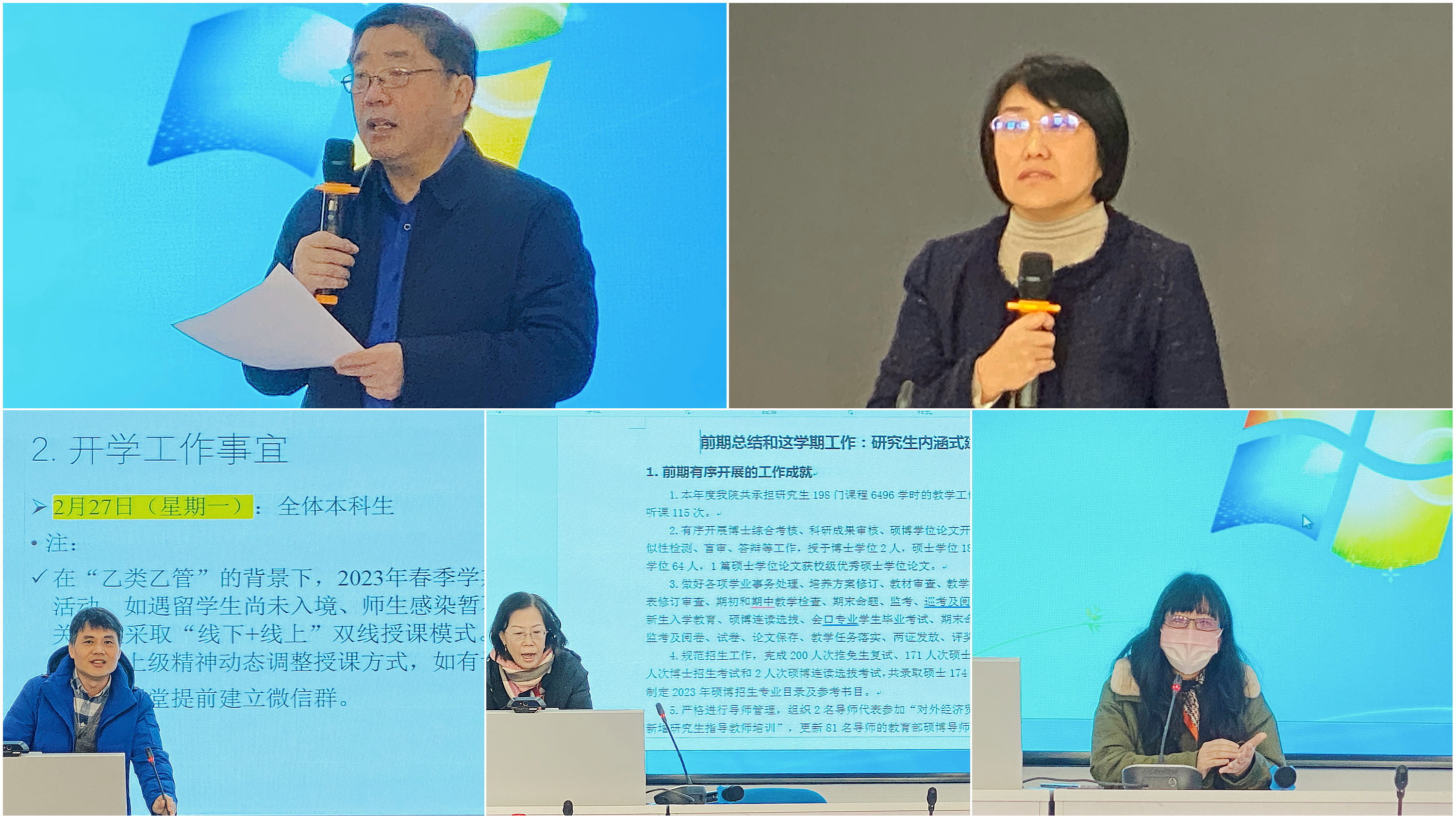 向明友院长作开场致辞,总结2022年工作,对全体教职工的辛苦付出表示感谢,表扬在疫情防控中做出突出贡献的教职工、在教学科研取得突出成绩的教师、高效高质完成学校交办的紧急任务的教师、长期关心关爱和帮扶学生的教职工;部署新学期要重点落实的工作,通报学院下一步建设目标,希望大家继续努力,为学院发展多做贡献。