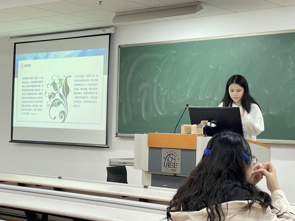 首先进行的是《“四说”新时代,打卡新思想》的读书分享。白昕翊同学强调了把握“新时代”正确内涵的重要性,她说:“只有对新时代的内涵有清晰的了解,当前的诸多理论和实践问题才能有更深层次的认知,认识我们的新时代、把握新时代脉搏。”接着,她简单概括了这本书的主要内容,并且就书中的精彩内容进行了详细解读。当提到20世纪70年代以来“三大件”的变化时,台下同学聚精会神,对我国几十年来的发展过程给人民生活带来的便利产生了极大的兴趣。最后,白昕翊同学引用书中的一句话作为结尾:“新时代属于每一个人,每一个人都是新时代的见证者、开创者、建设者”,希望能够激励新生代奋发自强,把握好属于自己的美好时代。