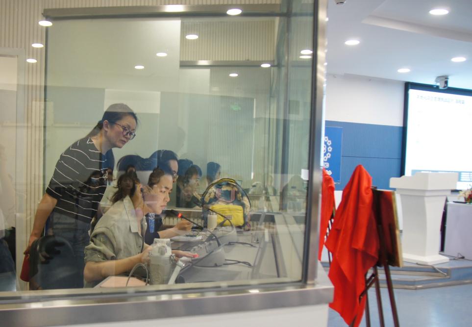(胡荣老师在同传箱现场为英语口译专业学生做同传实践指导)