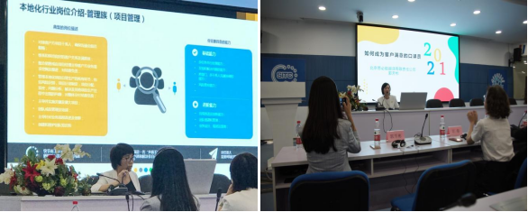 接下来,安翠平经理和郭芳彬经理分别作了题为《本地化项目管理实践》和《如何成为客户满意的口译员》的专场报告,介绍了本地化行业岗位、本地化项目管理、口译机会的把握、口译职业素养、以及作为口译员的注意事项,使学院学生深受启发。