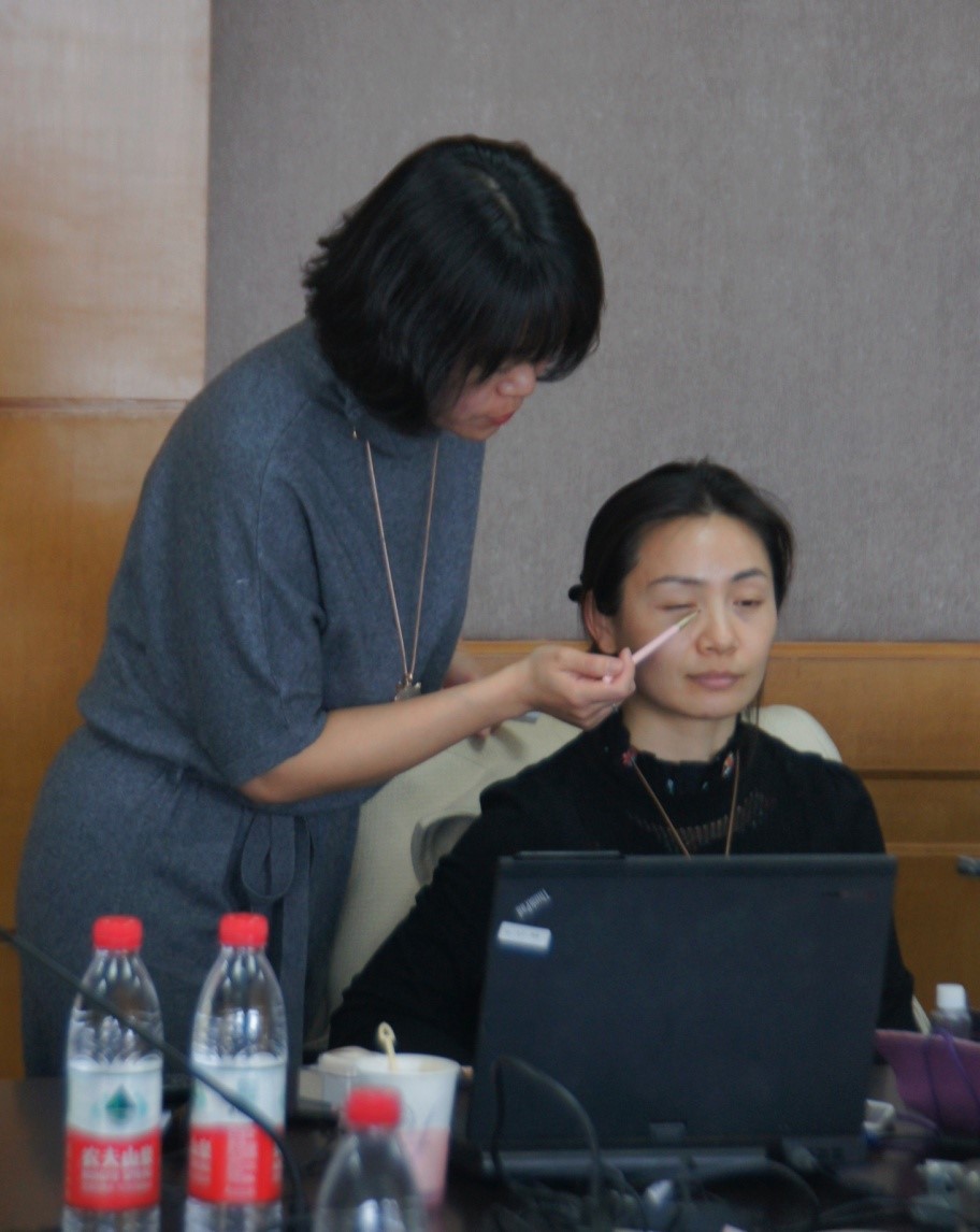 充分沟通之后,阳老师针对大家的问题在讲座过程中进行了一一解答。她首先从人体色彩的小知识入手,接着详细讲解了日常彩妆的步骤,并用各种化妆品实物给大家做了示范。
