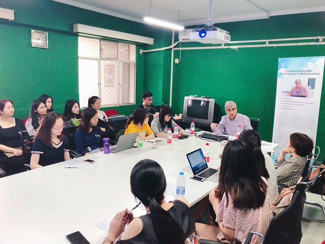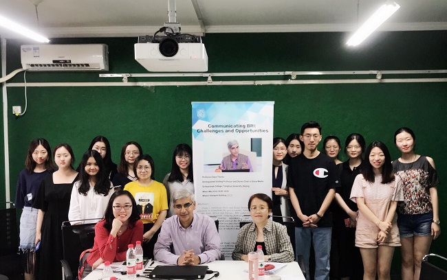 第二届“一带一路”高峰论坛成功举办之际,应我院国际财经新闻研究中心主任钱晶晶老师邀请,全球传播领域世界知名学者达雅·屠苏(Daya Thussu)教授于5月23日下午莅临水果派解说 ,就新形势下我国对外经济传播作了一场题为“传播‘一带一路’:机遇与挑战”的专题讲座。我院语言文学系主任王彦教授、外国语言学与应用语言学专业、商务口译专业以及英语财经新闻专业多名同学到场参加讲座。