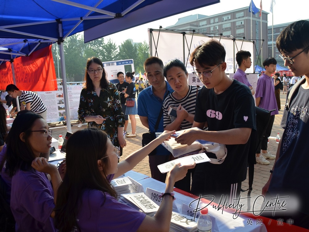 工作人员正在为新生发放迎新材料