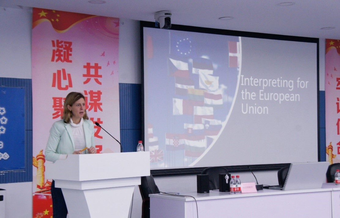 欧盟口译总司是世界上最大的口译服务机构,采取多语言工作机制,为其成员国提供覆盖24种官方语言的多样化口译服务,包括耳语同传、交替传译及同声传译等不同类型。Conroy女士在讲座中讲述了自己语言学习和口译工作的经历,以及成为一名职业译员应具备的基本素质和能力。她还介绍了欧盟内部会议口译工作概况以及欧盟口译总司的主要职责。Conroy女士展示了一份欧盟口译总司译员的日常工作表,让大家对于欧盟口译总司的工作安排有了进一步了解。讲座最后的问答环节,Conroy女士认真仔细地解答了同学们的问题,如口译学习中的难点、如何平衡宏观语言学习和具体笔记练习以及人工智能对翻译行业的影响等。此外,胡荣老师为同学们解答了有关中欧高级译员培训中心招生以及入学考试的问题。