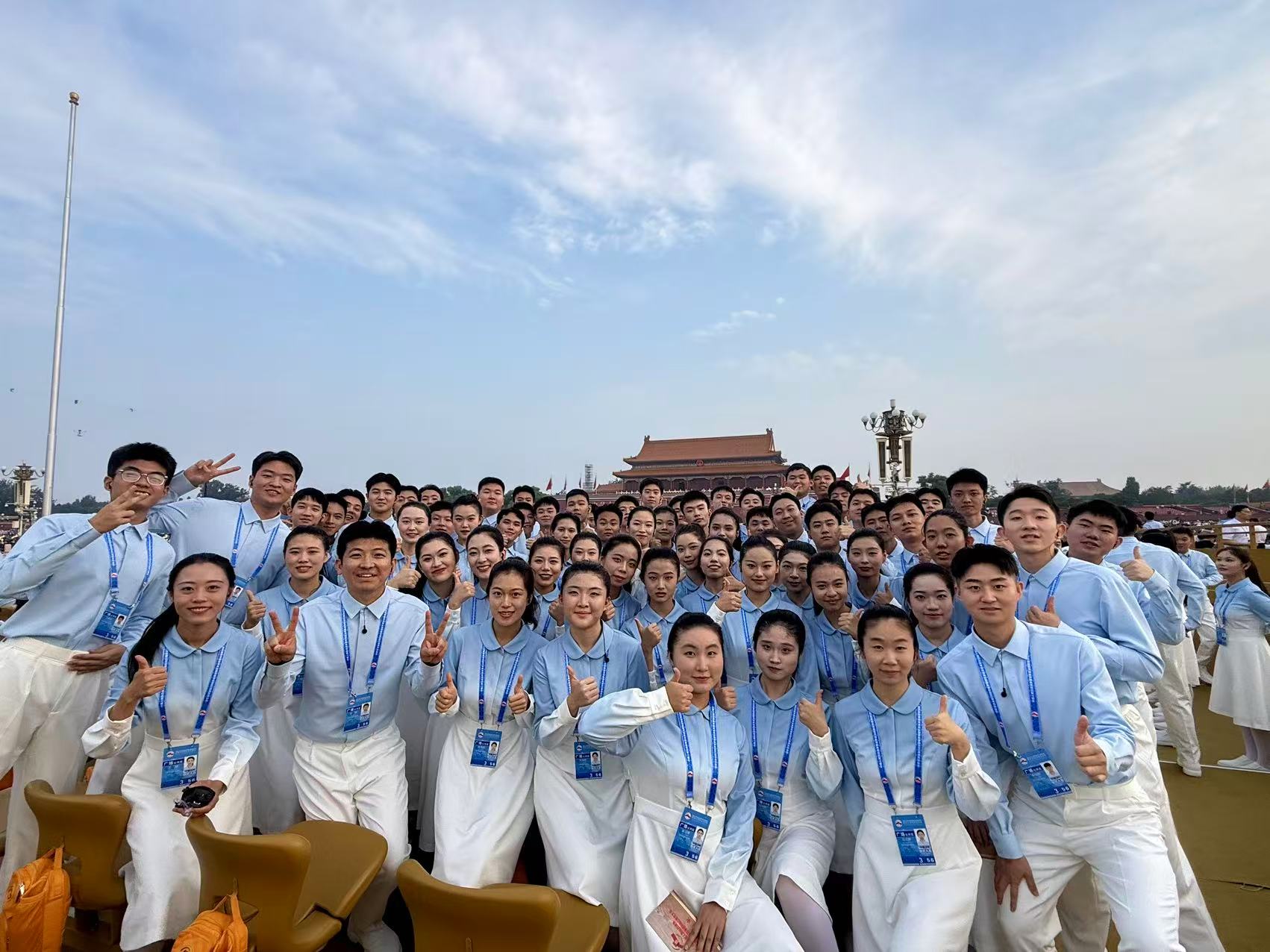 很荣幸能成为本次阅兵广场合唱团的一员。接近四个月的训练中,我和同学们和老师们结下了深厚的情谊。很感谢同学和老师们的相互陪伴与指导。站在庄严的广场上,紧贴祖国的心房,面对整齐的方阵与昂扬的国旗,我深切感受到祖国的力量与民族的凝聚。合唱不仅是艺术的呈现,更是精神的传递,它让我们在歌声中彼此相连,与国家的命运紧紧相依。现场观礼,感受中国军人和军备的宏伟让我深刻体会到作为青年一代所肩负的责任。我们要在自己的岗位上努力奋斗,不辜负这个伟大的时代。能以歌声见证祖国的强盛,是我人生中一段极其宝贵的记忆。