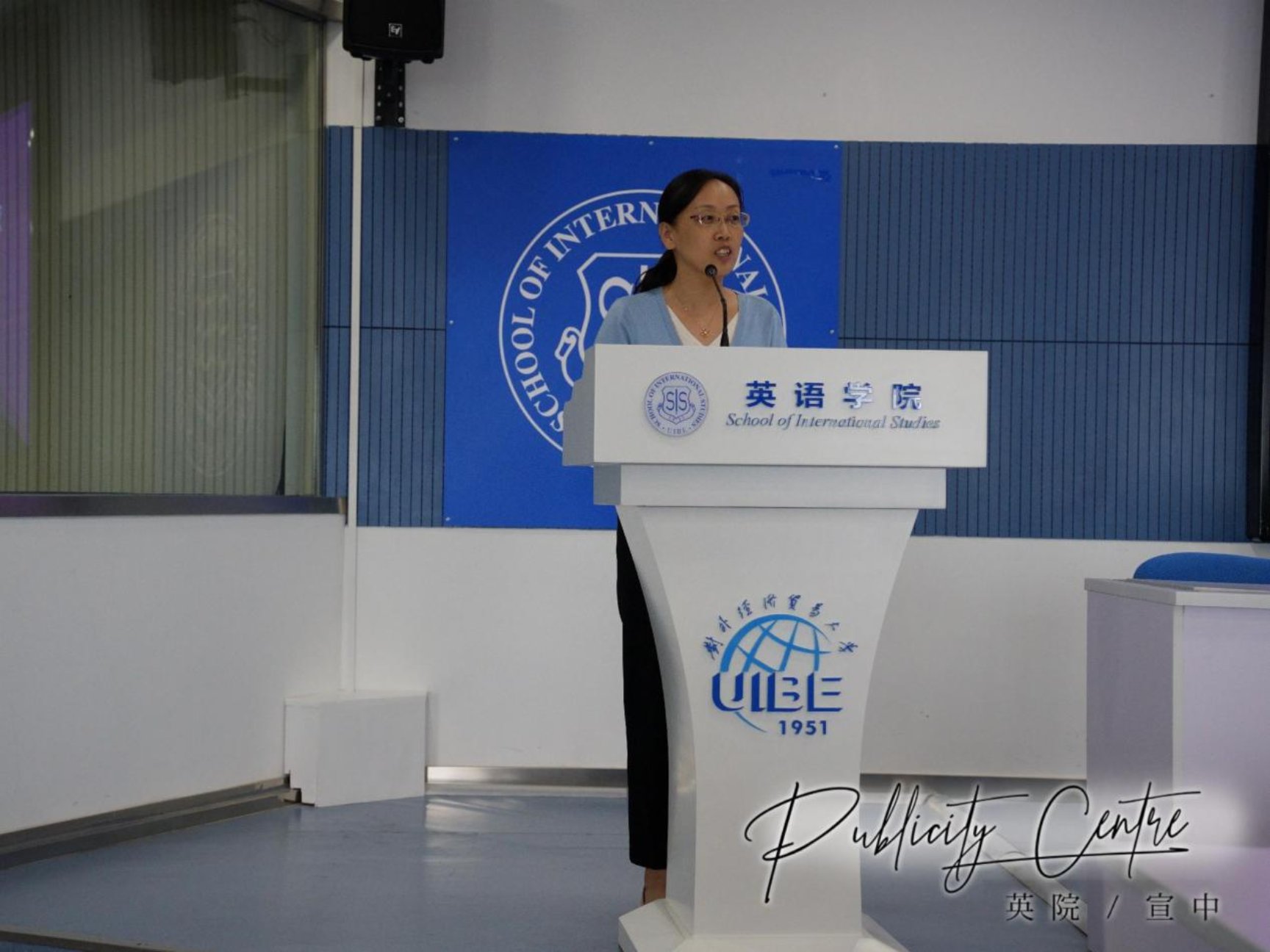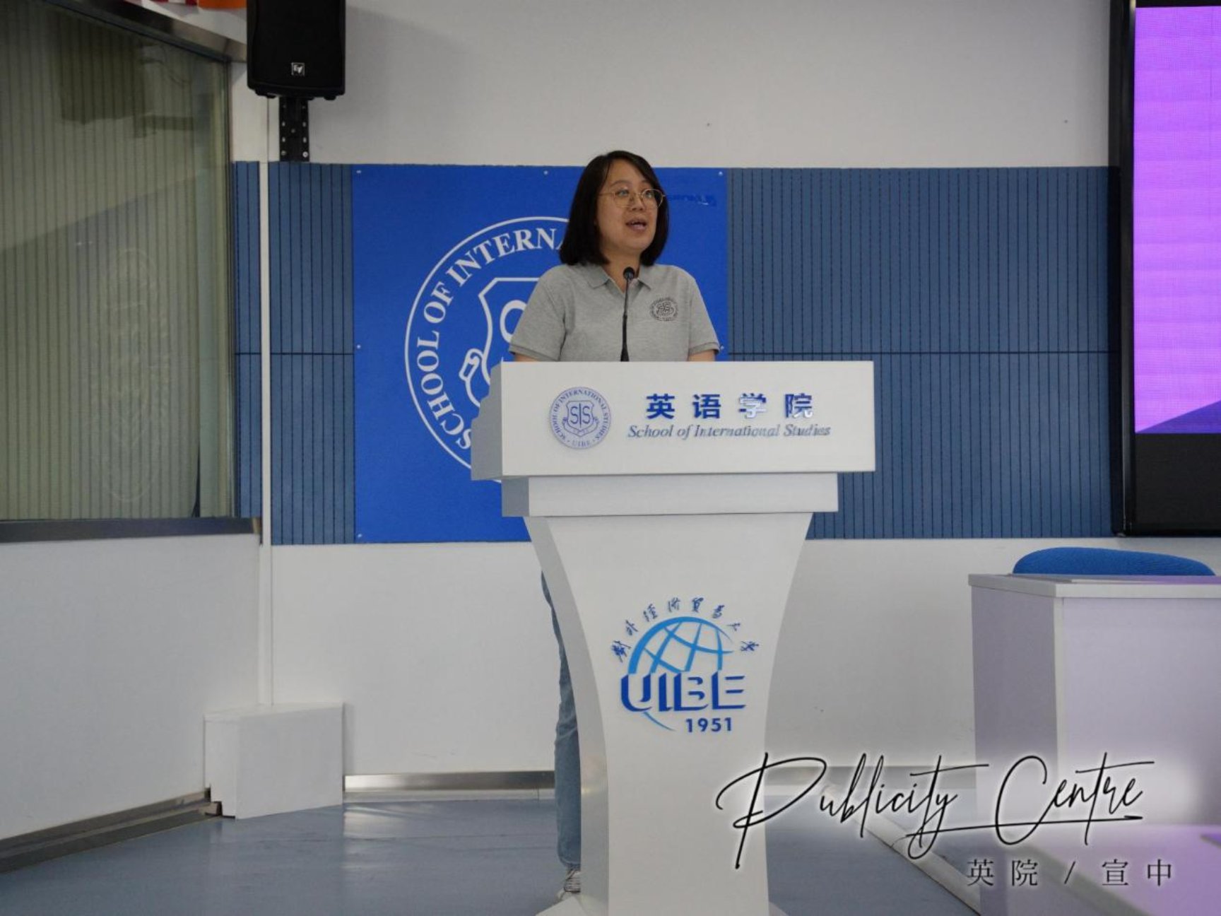之后是赵丹彤副院长讲话。她从工作的实际出发,就会前收集到的人才培养相关的问题进行讲解。讲解的内容包括大类分流、双学士学位以及辅修等学习制度。她也提到了学院为了提升学生英语水平所采取的一系列教学方法,同时建议各位家长引导同学及时关注,合理利用,以便新生尽快适应英语专业学习生活。