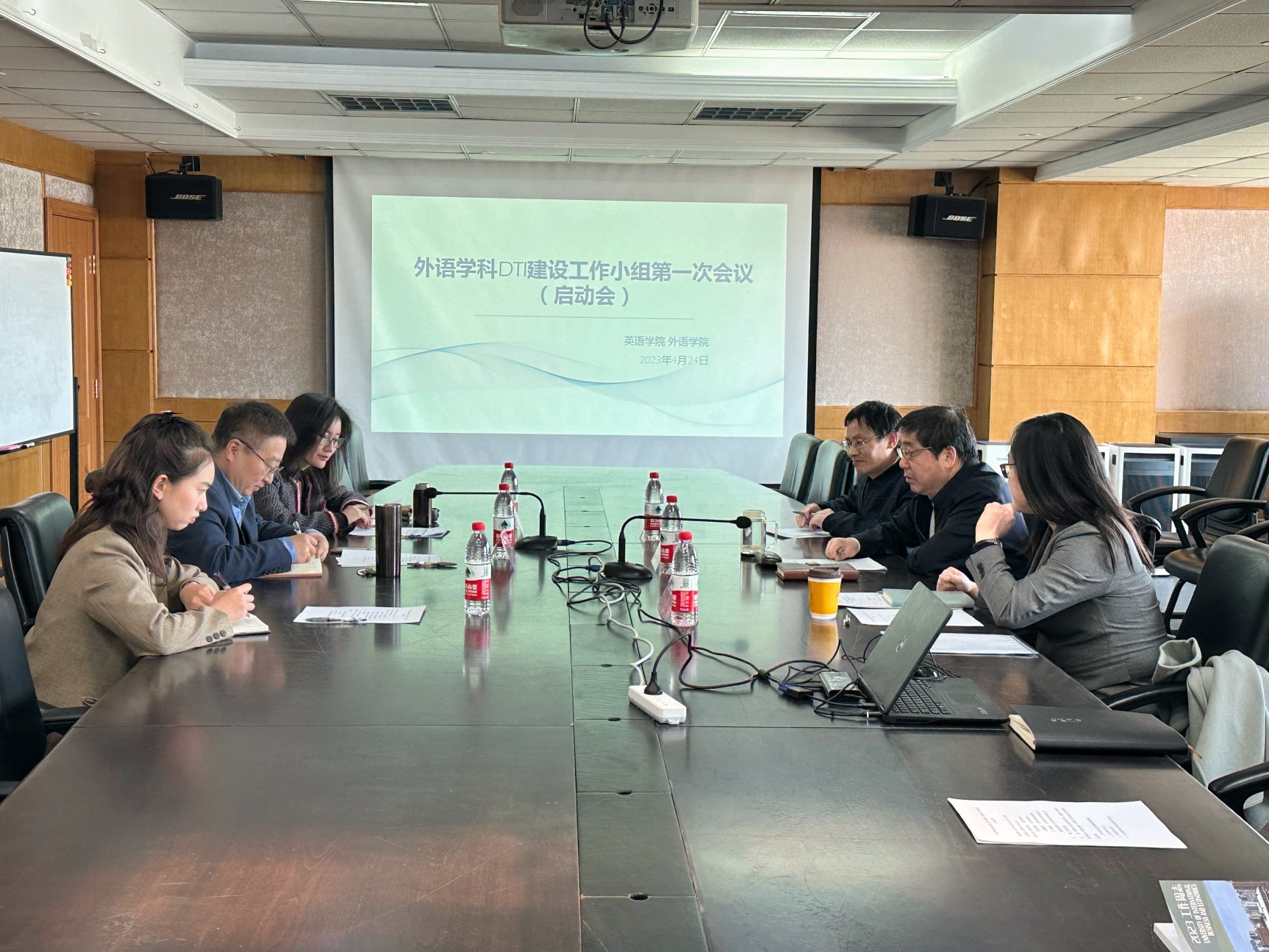 2023年4月24日下午,两院DTI申报工作小组第一次会议在诚信楼1314会议室召开。外语学院院长李运博教授、水果派解说 院长向明友教授、商务英语系主任李琳教授、国际传播系主任钱晶晶副教授、翻译学系王建国教授以及两院科研、学科、研究生教学秘书参加会议。会议由向明友院长主持。