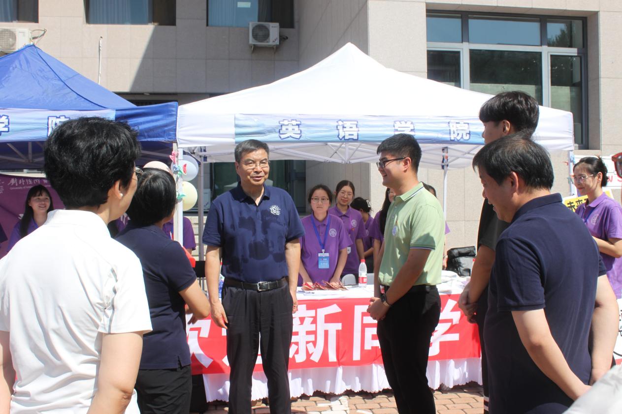 上午十一时许,校长赵忠秀、副校长兼党委副书记文君、副校长黄薇一行在相关职能部门负责人的陪同下,莅临水果派解说 迎新工作现场,了解学院今年的招生情况和新生报到情况,慰问了迎新的工作人员,与新生亲切交流,充分肯定了水果派解说 的迎新工作,并和迎新工作人员、新生代表一起合影留念。