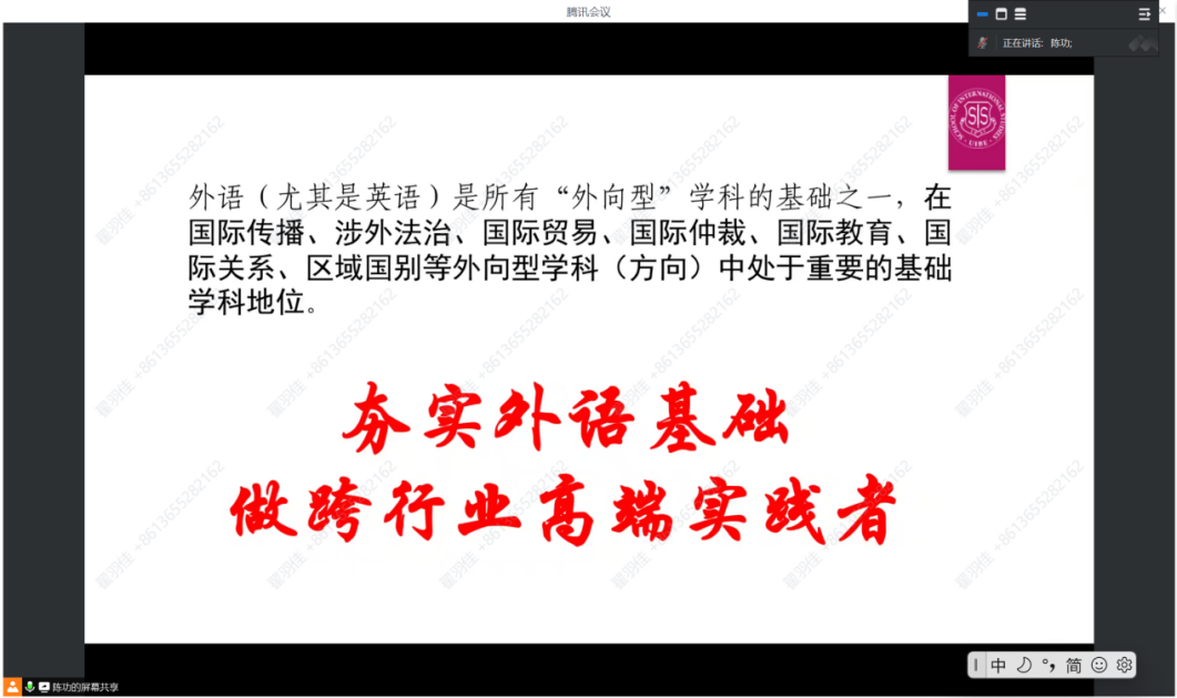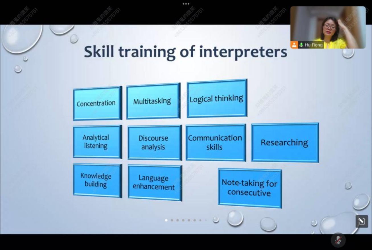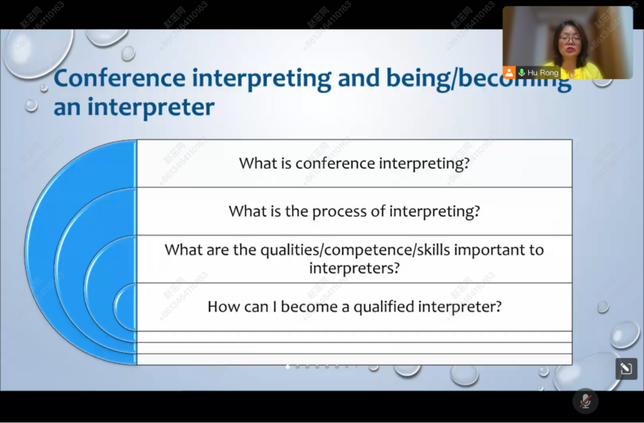 7月25日晚,我院翻译系胡荣副教授带来“职业译员的基本素养和口译学习的路径”主题讲座。胡老师首先介绍了自己在口译实践及教学方面的经验,随后围绕“什么是会议口译?”“一场正式口译的过程是怎样的?”“职业译员必须具备哪些素养或技能?”“‘我’如何才能成为一名合格译员?”四个问题展开。针对前两个问题,胡老师从亲身经历出发,通过展示自己曾参与的大型会议口译现场图片(2022北京冬奥会等),还原真实的口译现场及译员的态度表现。针对后两个问题,胡老师首先说明了口译实践的不同类型,随后从口译定义出发,引申出职业译员应具备的核心素养及技能。胡老师提醒同学们,想要成为一名优秀的口译员,需要“锻炼专业技能”与“构建自身核心竞争力”两手抓。日常应加强训练沟通能力、多任务处理能力、逻辑思考能力、辩证性分析听力能力、话语分析能力、双语能力、速记能力等,打铁还需自身硬。