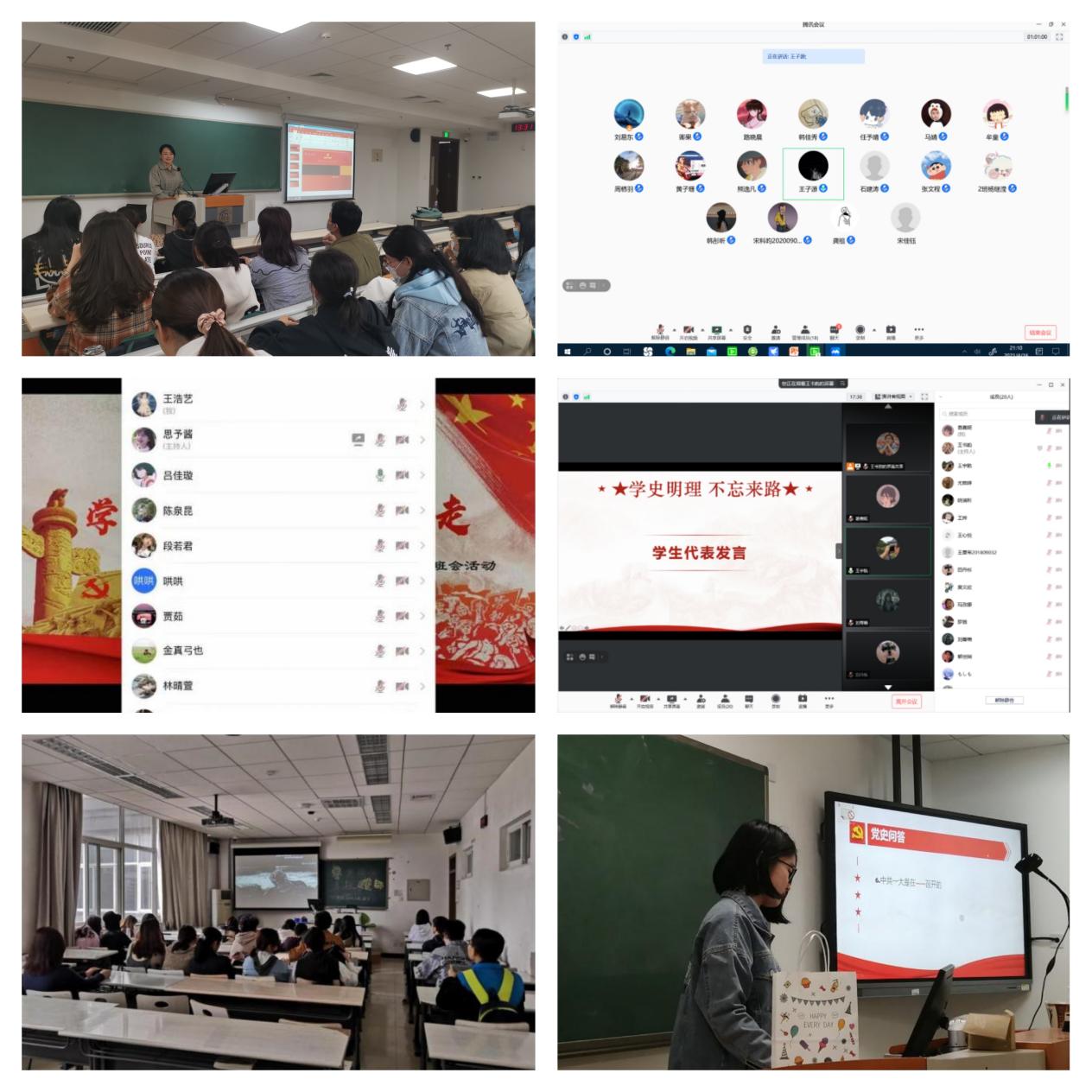 英语2001班、2002班、商英1804班、1809班班会内容以时间为基本线索,学习新民主主义革命时期、社会主义革命和建设时期、改革开放新时期、党的十八大以来四个阶段历史,结合学习习近平总书记重要著作篇目、习近平总书记在党史学习教育动员大会上的重要讲话。2004班、2005班在党史案例讲解基础上通过党史知识问答形式,在互动中加深了对党史知识的了解和兴趣。