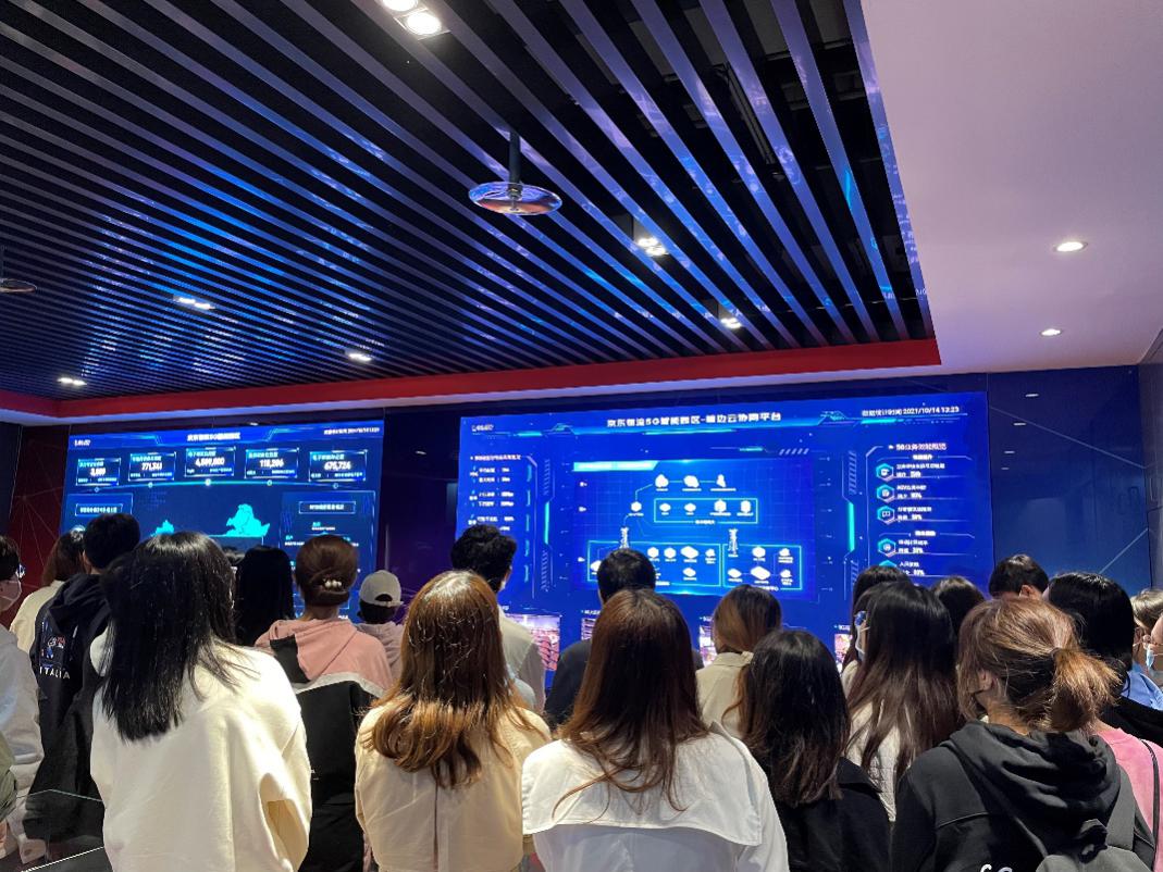 老师和同学们跟随讲解员走进北京亚洲一号智能园区,看到大型挂车在各个仓口川流不息接送货物,工人在仓库内忙着打包、分拣和搬运。讲解员介绍,这一智能物流园充分利用了智能化分拣设备、AGV搬运机器人、无人驾驶叉车、AR/VR引导、人工智能识别监控,大数据物流仿真和数字孪生、以及通过覆盖园区的5G通信平台,实现海量数据高速低延时的实时传输,快递物流分拣能力大大提升,货仓内井井有条。