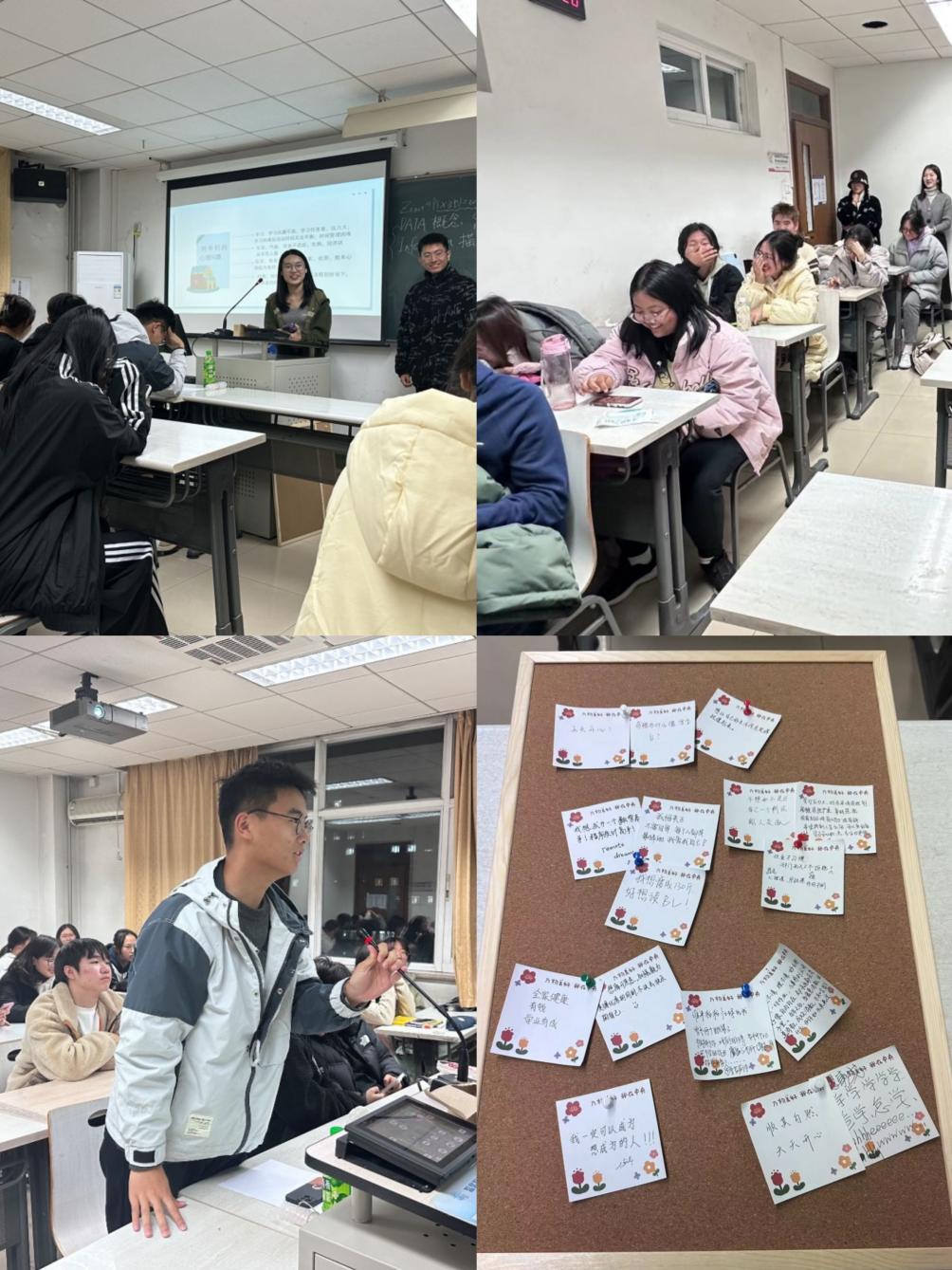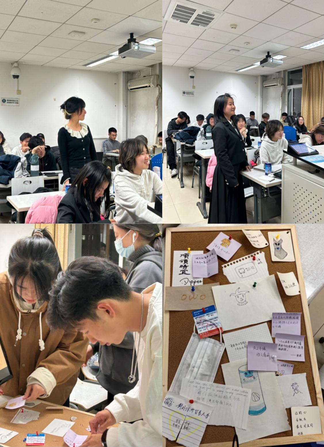 文经2301班借助有趣的互动环节拉近了彼此心与心的距离。班长崔琳悦首先提醒同学们要正视自己的心理变化,并针对某些共性问题给出了合理的解决建议。在互动环节中,“初印象”使大家更清晰地了解他人眼中的自己,减少内耗;“匿名信箱”助力同学们大胆、勇敢提问;“拼贴画创作”彰显了每一位同学的个性与才华,令人印象深刻。