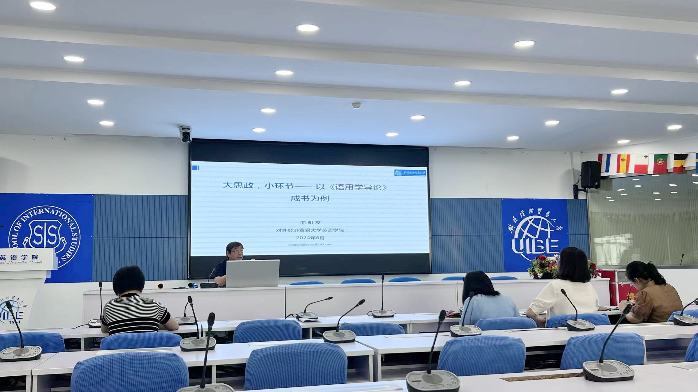向明友院长指出,培养良好师德师风要从认识新时代教育的核心问题,也就是培养什么人、怎么培养人、为谁培养人入手,要坚持围绕立德树人根本任务,把思想政治工作贯穿教育教学全过程。他深入剖析青年学子与党和国家所需人才之间存在的差距,解析大思政与课程思政的关联,并自己带领学生编写《语用学导论》为例,分享了如何实践课程思政的经验。