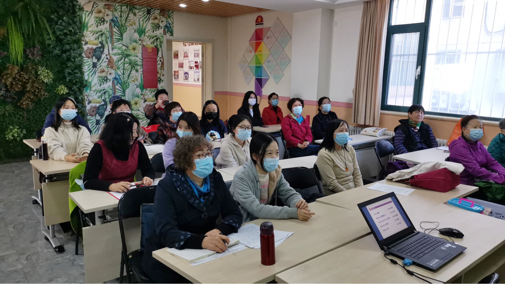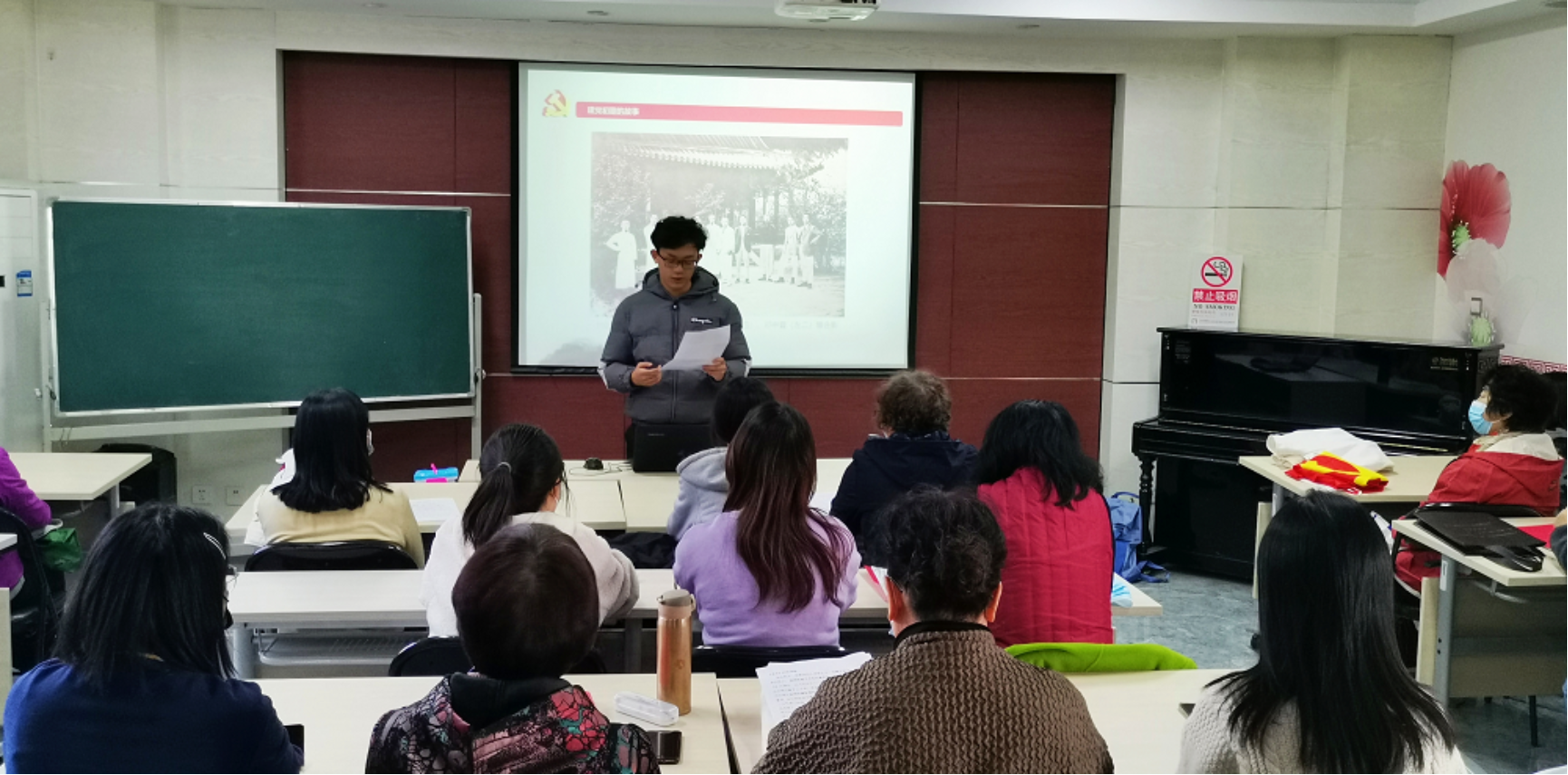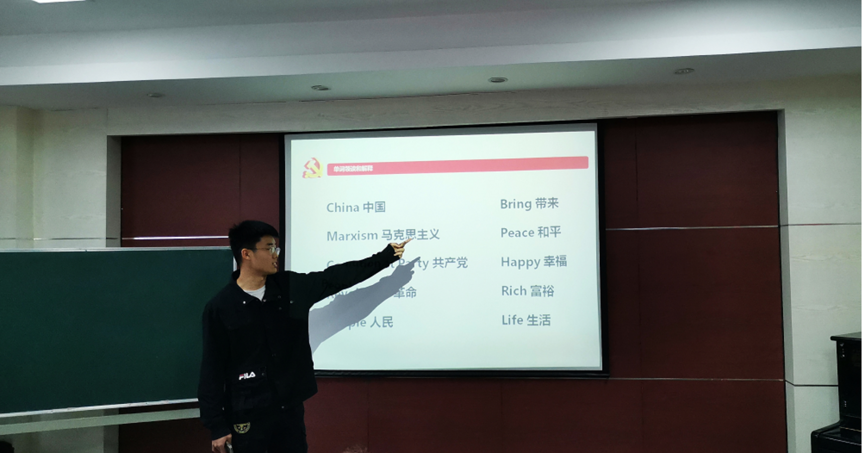 在“英文话党史”部分,张嘉桐同学讲解了与中国共产党相关的英语词汇,并带领大家一起朗读,各位入党积极分子也帮助阿姨们学习发音,并解答她们的疑惑。最后,以一首慷慨激昂的党诗为此次活动划上了圆满的句号。