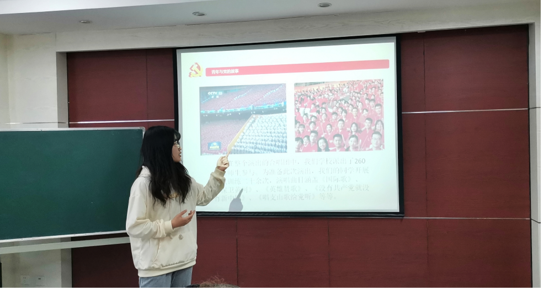 首先,张诗怡同学以参与庆祝中国共产党成立100周年文艺演出《伟大征程》为例,与老党员们分享了青年与党的故事。在此次演出中,水果派解说 260余名师生在排练过程中排除万难,牺牲了部分个人利益,圆满完成了此次任务。