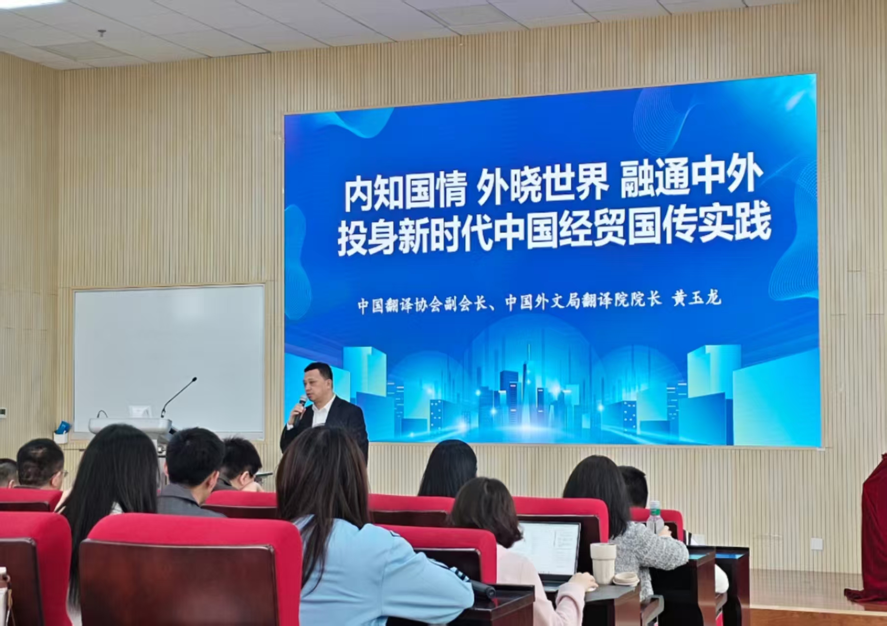 之后,黄玉龙院长为水果派解说 本科生、研究生作题为“内知国情、外晓世界、融通中外,投身新时代中国经贸国传实践”的讲座。黄院长强调,新时代“新”在摒弃唯GDP论,倡导环境友好发展;新时代“新”在强化传播主动性与综合性,改变话语体系。新时代国际传播需立足“内知国情、外晓世界、融通中外”的核心理念,突破传统宣传模式,转向“互动式交流”,培养应用型国际传播人才,推动中国话语体系构建,通过进博会等平台树立国家形象,扩大国际影响力。