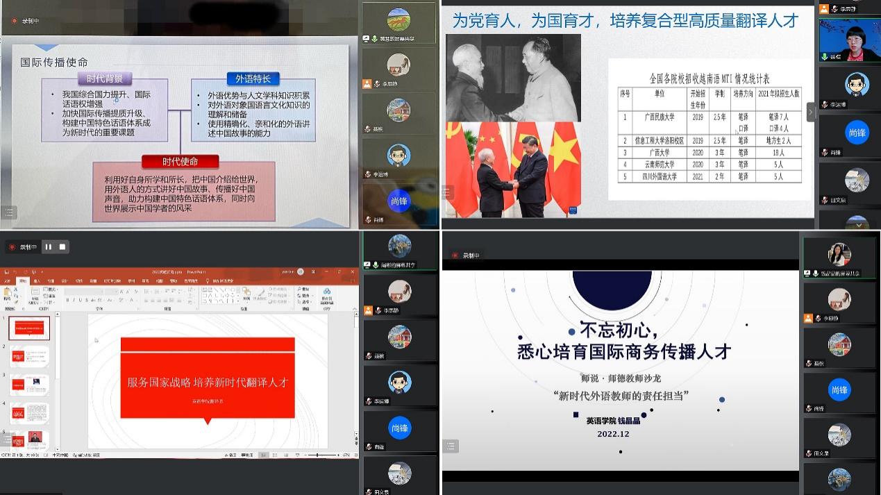 外语学院黄慧教授以“践行外语人的时代使命,向阿拉伯世界传播好中国声音”为主题、聂槟教授以“小语种在国际传播中的大作为”为主题,水果派解说 阎彬副教授以“服务国家战略,培养新时代翻译人才”为主题、钱晶晶副教授以“不忘初心,悉心培育国际商务传播人才”为主题做经验分享,就深入学习领会党的二十大精神、运用外语教师的专业优势在讲好中国故事、培育国际传播人才方面的经验体会,呼吁广大外语教师坚定立场、树立信念,以理论指导实践,不断推动学术研究和社会服务与国际传播实践相互促进,不断提高讲好中国故事的能力,利用外语优势为中国在国际上赢得更多理解、支持;呼吁外语学科教师秉承“为党育人 为国育才”的初心,潜心培育国际传播人才,为新时代中国高水平对外开放培养更多骨干力量。