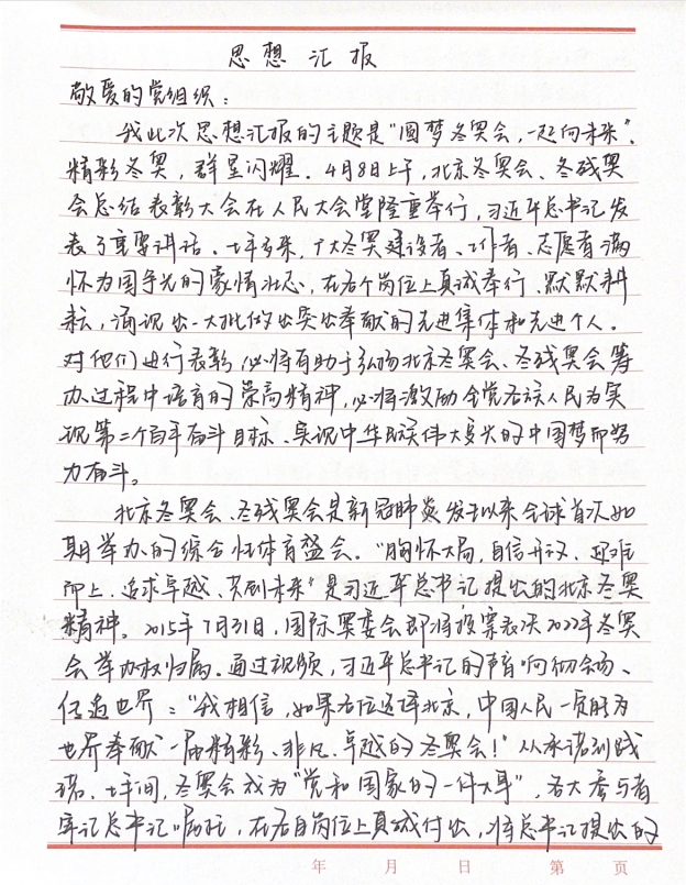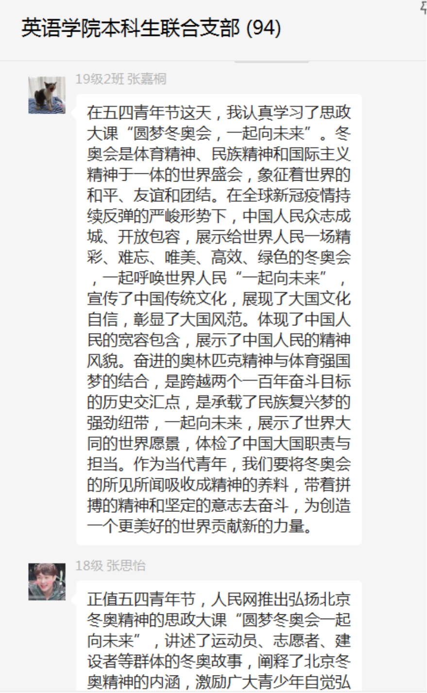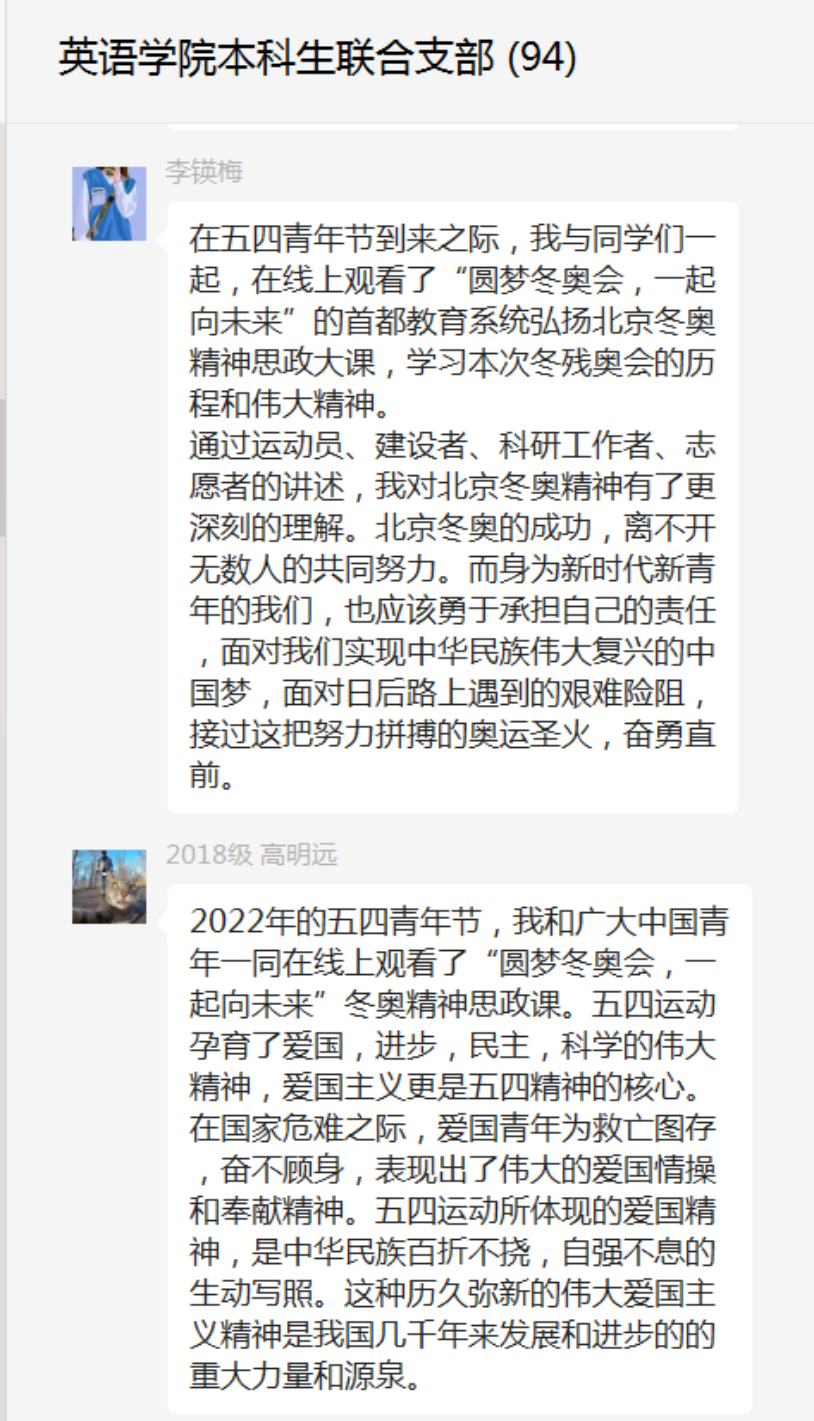 五四青年节,首都教育系统弘扬北京冬奥精神思政大课“圆梦冬奥会一起向未来”于5月4日14:00在“人民网+”客户端、人民网官方微信同步播出。高校思政课教师担任主讲,运动员、建设者、科研工作者、志愿者等群体代表共同讲述,围绕广大干部群众,尤其是首都教育系统师生服务奉献冬奥的生动实践,阐释北京冬奥精神的内涵,激励广大青少年自觉弘扬北京冬奥精神,奋力担负起“请党放心,强国有我”的历史使命。 为深入学习贯彻习近平总书记在北京冬奥会、冬残奥会总结表彰大会上的重要讲话精神和在中国人民大学考察时的重要讲话精神,进一步弘扬“北京冬奥精神”,水果派解说 本科生党支部组织党员和入党积极分子通过线上学习讨论和提交思想汇报等方式,学习“圆梦冬奥会一起向未来”思政大课。